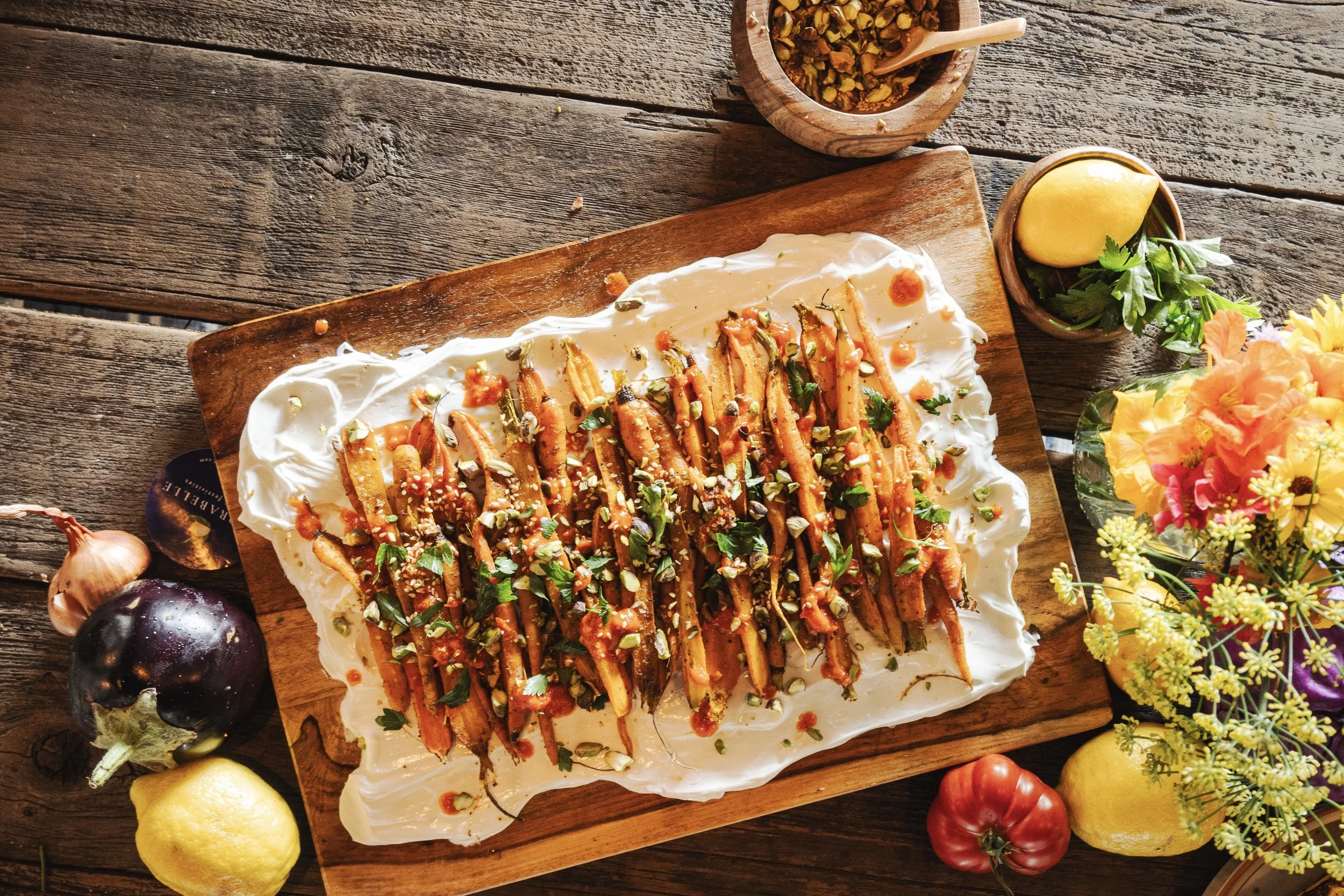 Roasted Harissa Carrots with Rose Water Labneh and Pistachio Dukkah